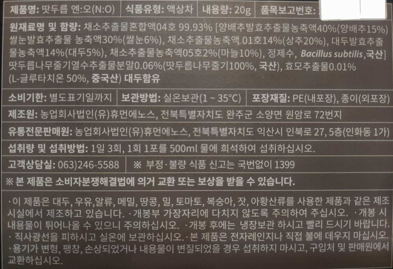 | 제조원 및 소재지 | 상품페이농업회사법인(유)휴먼에노스, 전북특별자치도 완주군 소양면 원암로72번지지 참고 |